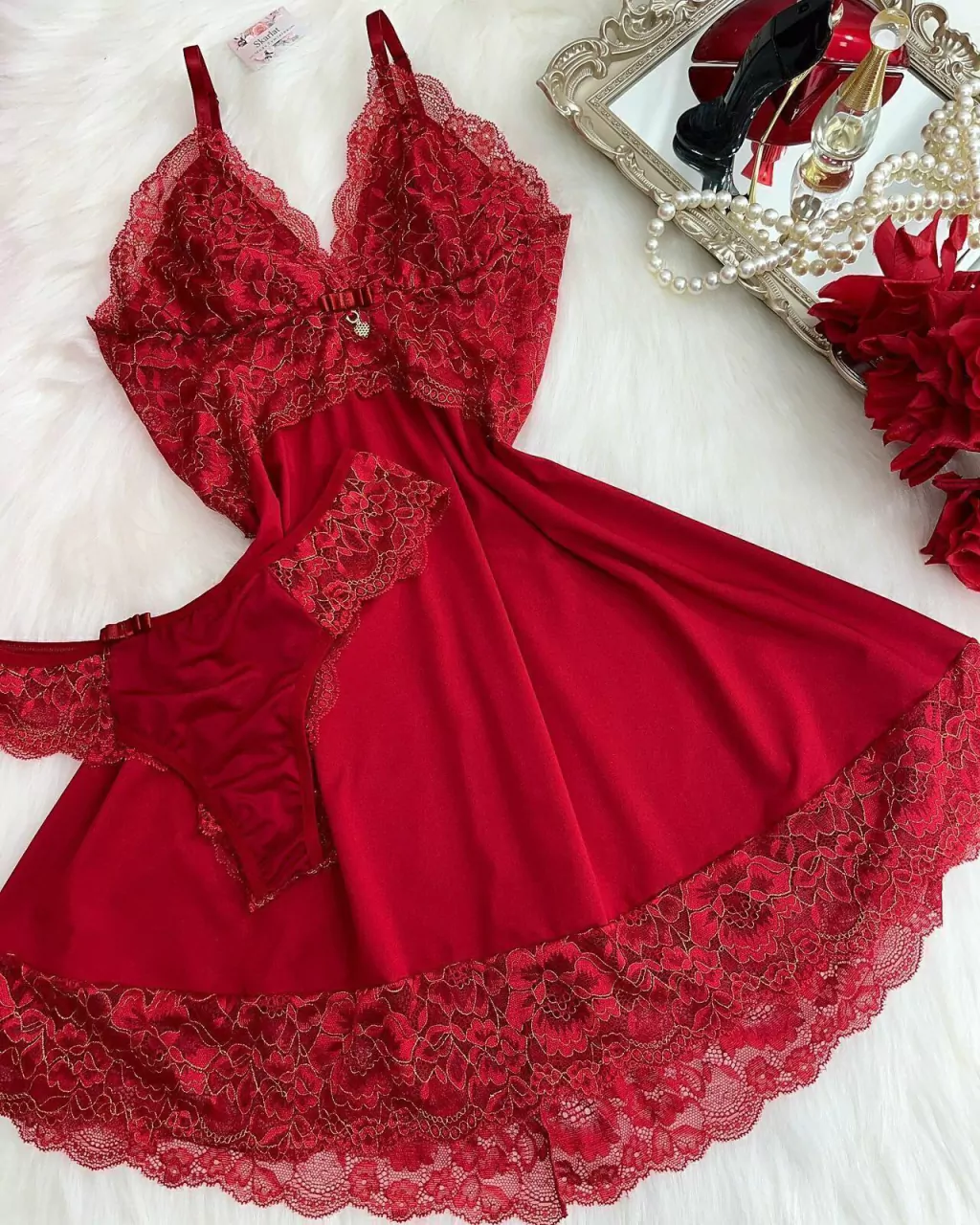 Acompanha uma calcinha com lacinho gravata na frente e laterais em renda com linhas douradas, proporcionando acabamento delicado e caimento ideal. O fundo forrado 100% algodão assegura conforto e praticidade para o uso diário.