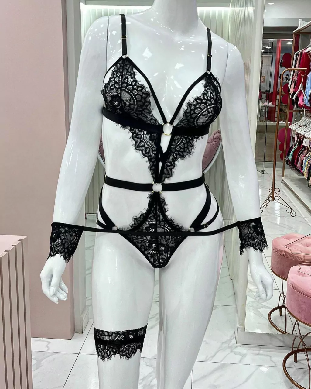Confeccionada em renda chantilly de alta qualidade, esta lingerie destaca-se pela delicadeza Além disso, o conjunto acompanha algema de renda e perneira com lacinho delicado, trazendo um detalhe exclusivo e sofisticado que valoriza ainda mais o visual. As alças reforçadas asseguram maior sustentação e conforto durante o uso.