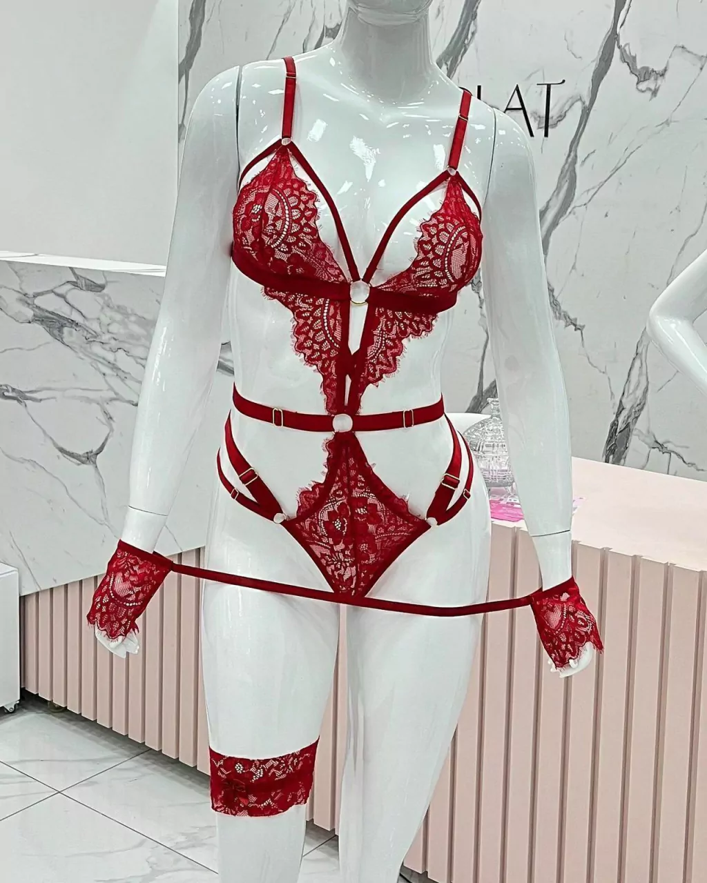 Confeccionada em renda chantilly de alta qualidade, esta lingerie destaca-se pela delicadeza Além disso, o conjunto acompanha algema de renda e perneira com lacinho delicado, trazendo um detalhe exclusivo e sofisticado que valoriza ainda mais o visual. As alças reforçadas asseguram maior sustentação e conforto durante o uso.